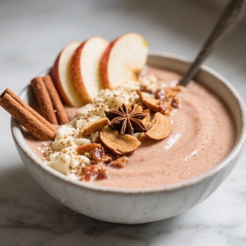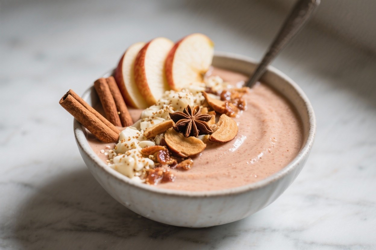 This smoothie bowl packs the sweet, spiced vibe of apple-cinnamon without heavy sugar or complicated steps. The texture is thick and creamy, ideal for toppings that add contrast and crunch.