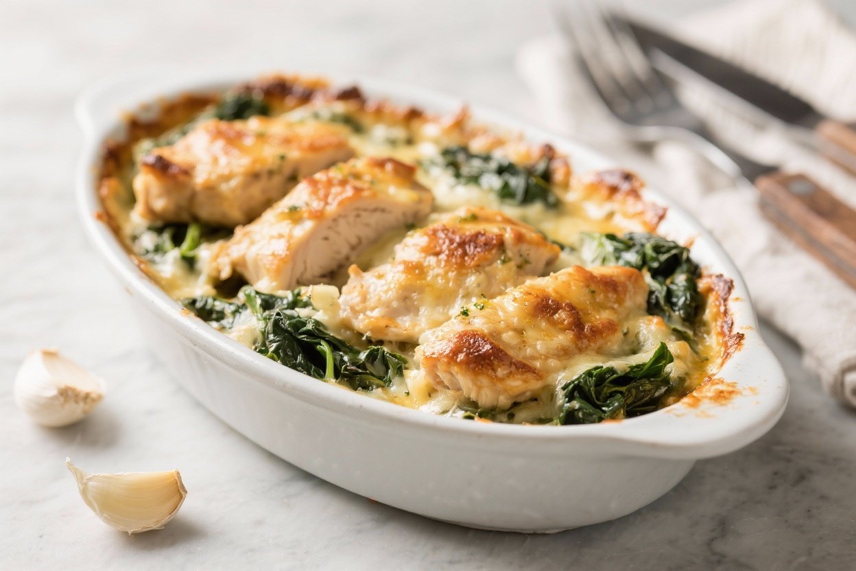 Cheesy Garlic Chicken & Spinach Bake – Comforting, Creamy, and Easy