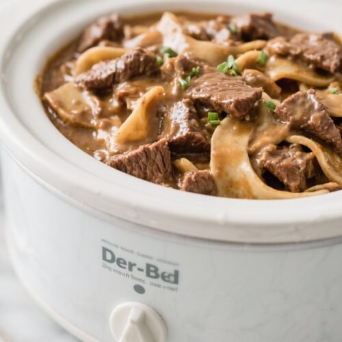 - Ground beef stroganoff: Brown 1.5 pounds ground beef with onions on the stove, drain, then add to the crockpot with the rest of the ingredients. Reduce cook time to 3–4 hours on Low.