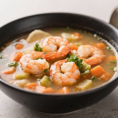 This is the kind of soup you make when you want something warm, bright, and satisfying without spending an hour in the kitchen. It’s loaded with tender shrimp, colorful vegetables, and a simple, savory broth. The flavors are clean and fresh, with a hint of lemon and herbs to keep it lively.