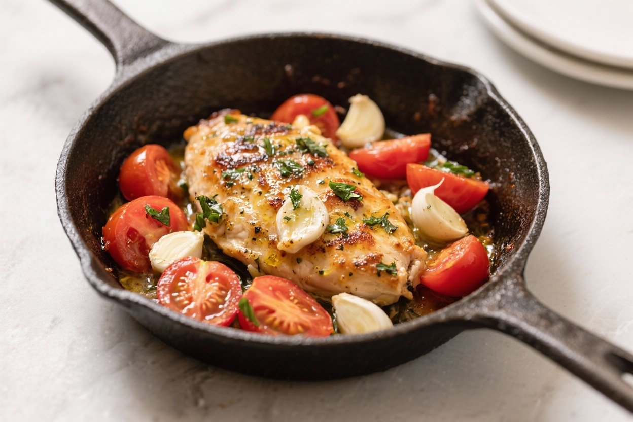 This dish hits a nice balance of protein, healthy fats, and fresh produce. Chicken breast provides lean protein to keep you full. Tomatoes add antioxidants like lycopene, especially when lightly cooked in olive oil and butter.