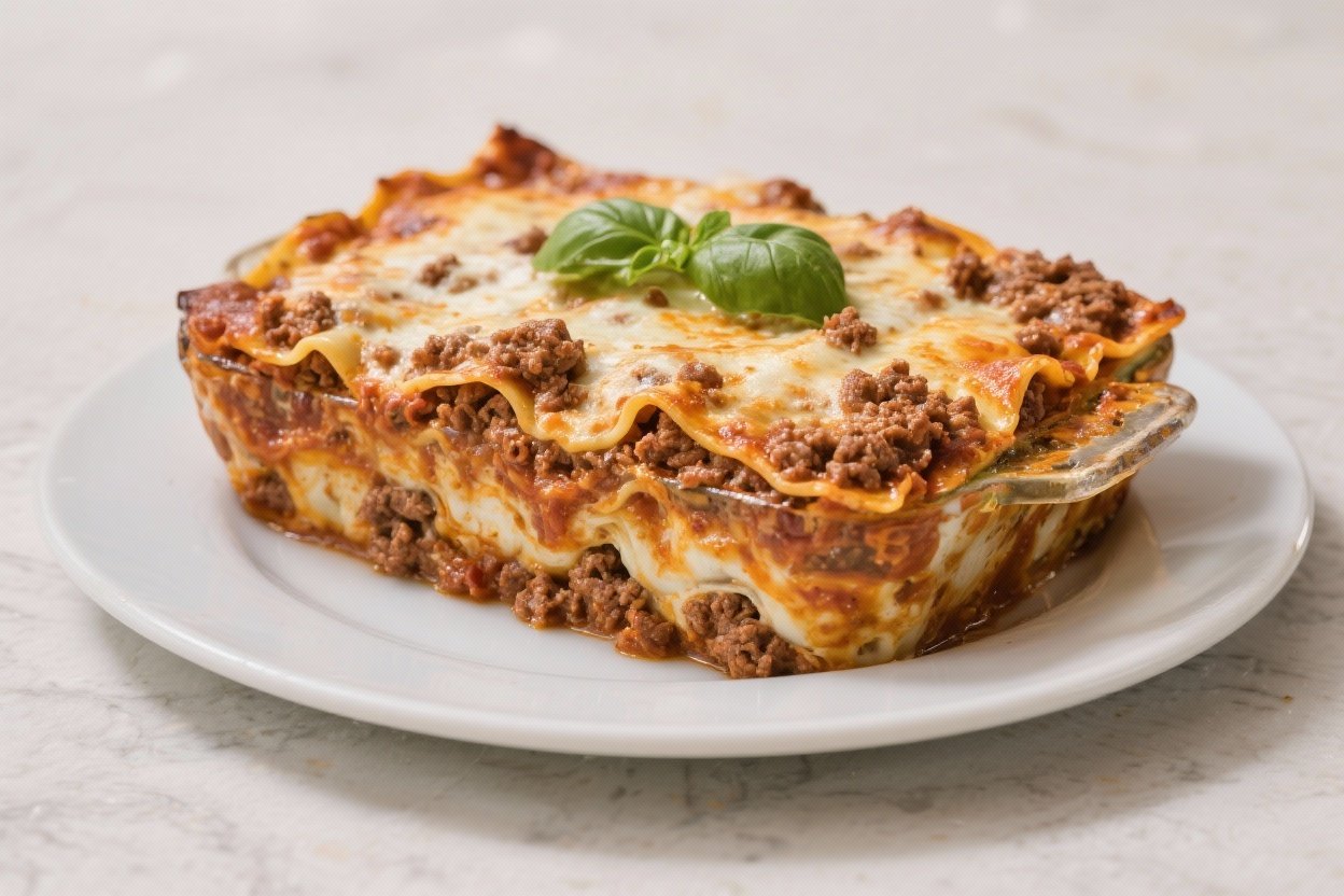 Final dish presentation: Restaurant-quality plated square of ground beef lasagna casserole on a matt