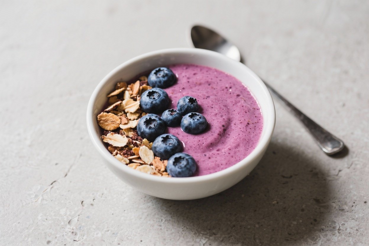 Frozen blueberries bring natural sweetness and a cool, spoonable texture without adding ice (aka no watery sadness). Greek yogurt or a dairy-free alternative adds creaminess and protein. A little banana offers body and natural sugars, while chia seeds thicken and keep the bowl satisfying.