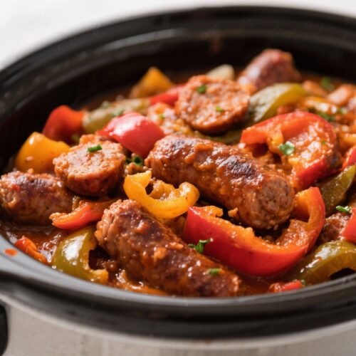 - Set and cook: Cover and cook on Low for 6–7 hours or High for 3–4 hours, until the sausage is fully cooked and the peppers are tender.