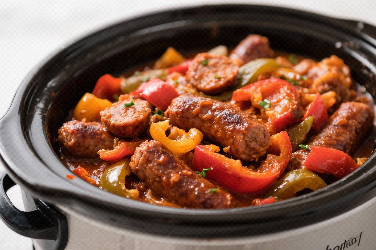 - Set and cook: Cover and cook on Low for 6–7 hours or High for 3–4 hours, until the sausage is fully cooked and the peppers are tender.