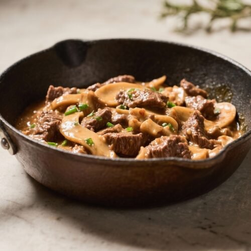 - Ground Beef Stroganoff: Swap sliced steak for 1.25–1.5 pounds ground beef. Brown fully, drain excess fat if needed, then proceed with the sauce.