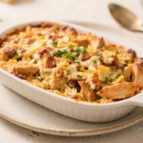 It’s easy to adapt, simple to prep, and reliable for busy nights. Keep the pantry staples on hand, use whatever cooked chicken you’ve got, and let the oven do the rest. It’s the kind of meal you’ll come back to again and again—rich, cozy, and weeknight-friendly.