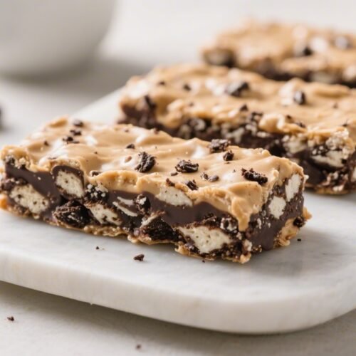 - High-protein and actually tasty: The bars are creamy from nut butter and yogurt, with a cookies-and-cream vibe from crushed chocolate sandwich cookies.