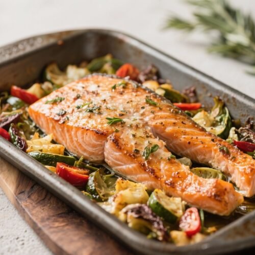Roasting everything on one pan means the vegetables soften and release juices that mingle with olive oil, garlic, and herbs. The salmon absorbs this sauce as it cooks, so every bite is seasoned from the inside out. It’s simple, smart, and reliably delicious.