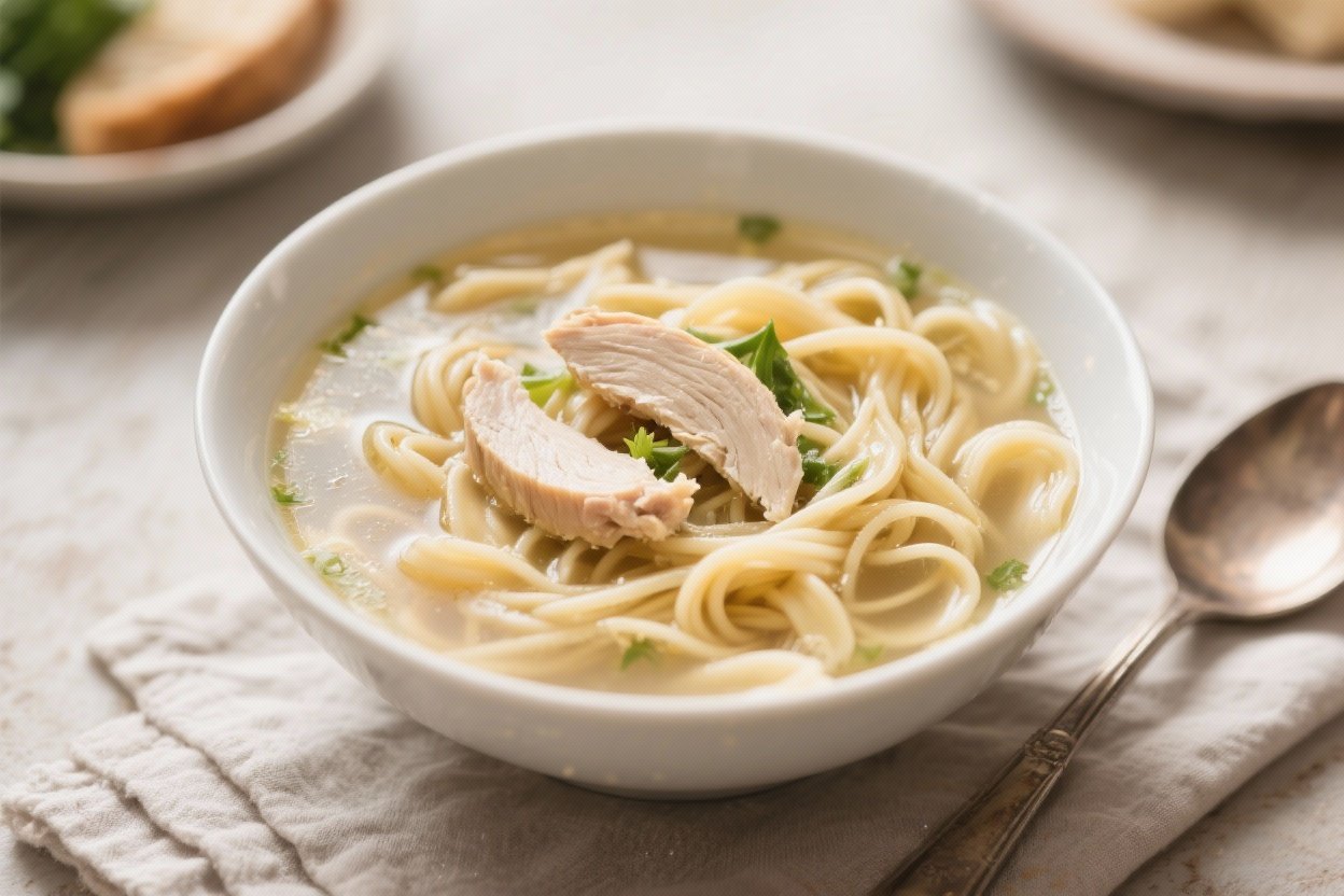 We use chicken thighs for richer flavor and tenderness, along with egg noodles that stay pleasantly springy. A quick splash of lemon and a touch of fresh herbs at the end brighten the broth without overpowering it. The result is a clean, satisfying soup with just the right amount of comfort.