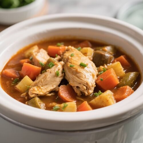 You’ll get tender chicken, soft potatoes, and a mix of vegetables in a savory broth that tastes like you simmered it for hours—because you did, but the slow cooker did all the work. It’s family-friendly, freezer-friendly, and worth adding to your regular rotation.