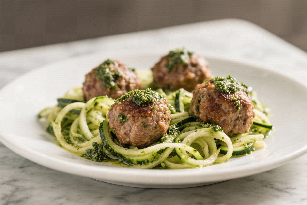 • Reheat: Warm meatballs over low heat in a skillet with a tablespoon of water, then fold in fresh pesto off heat. Toss fresh zoodles for 60–90 seconds right before serving.